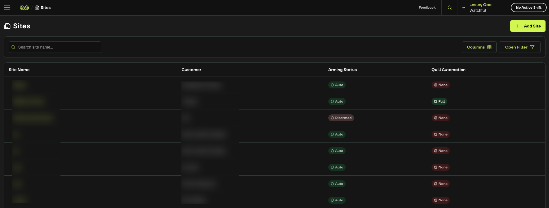 Monitoring activities are organised by site. Within the Sites section, you can access: