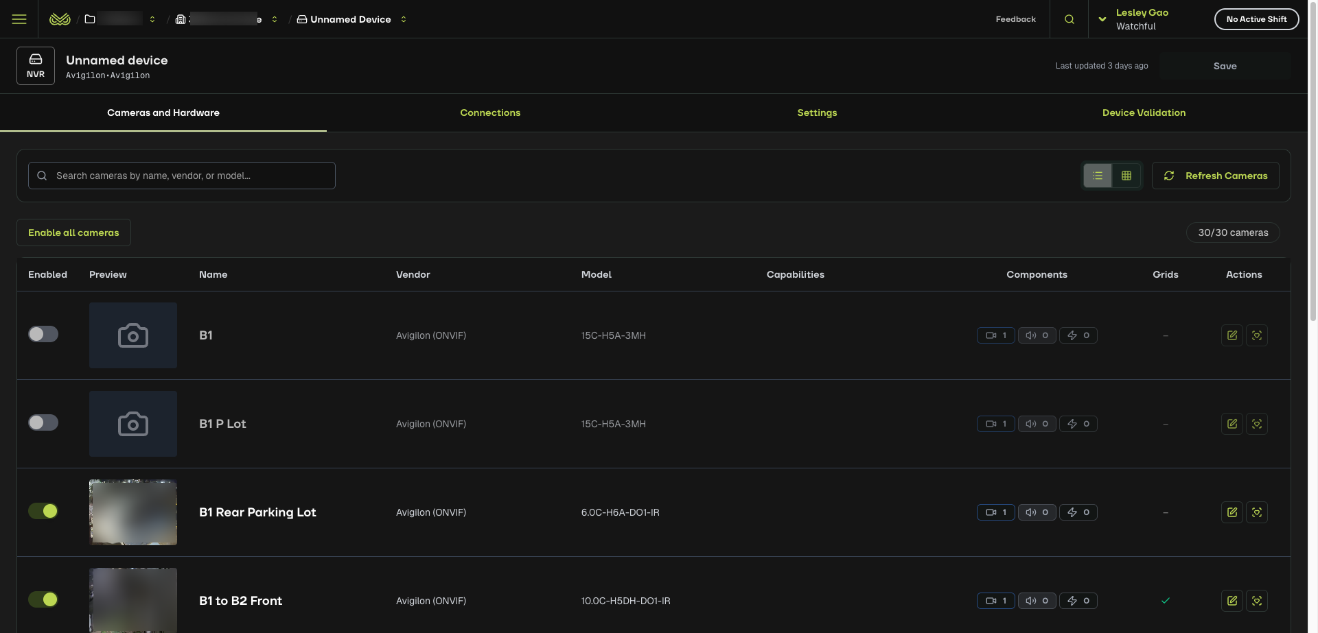 Components - View a comprehensive visualisation of all the devices (camera, speaker, relay) connected to the site.