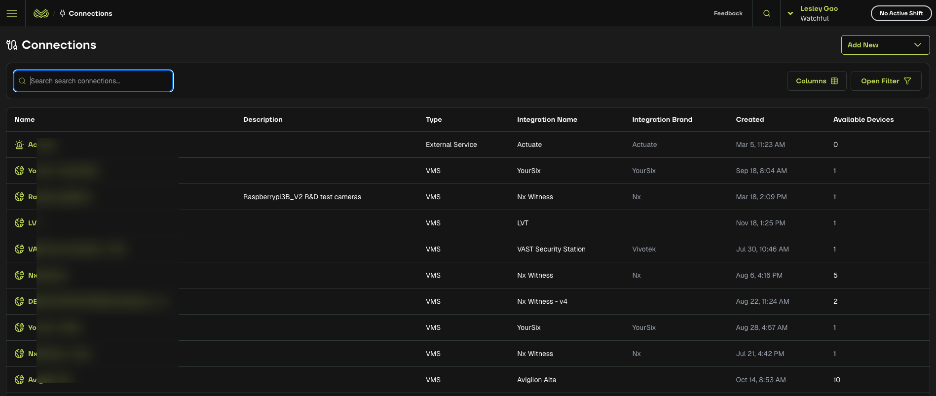 Manage integrations/connections between Watchful and your cloud-based VMS platforms.