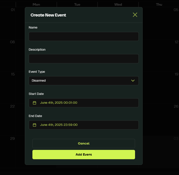 Choose Armed or Disarmed under Event Type, then click Add Event.