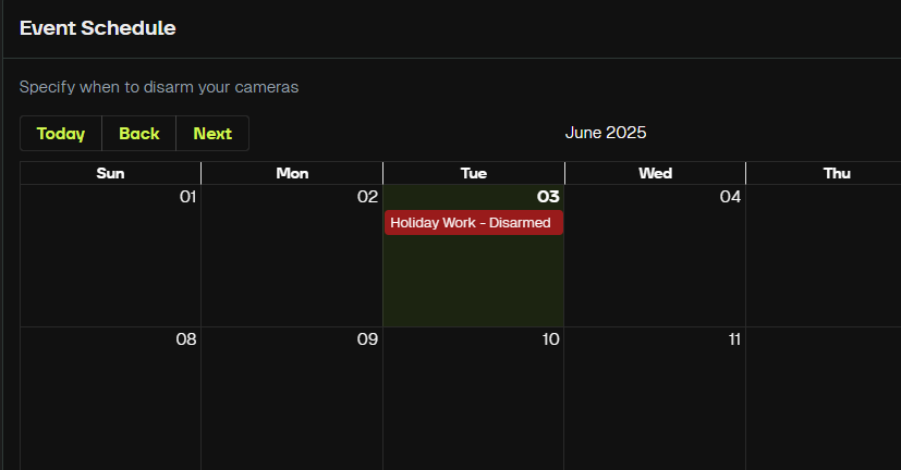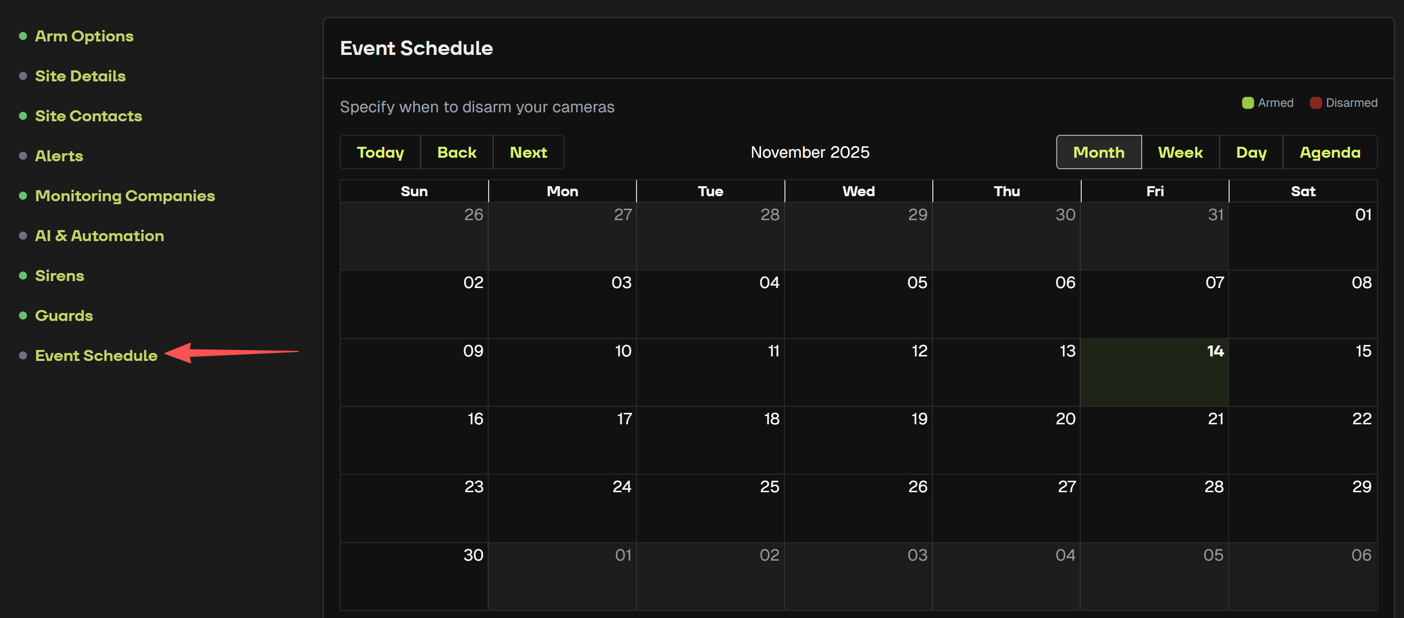 The Event Schedule lets you easily control when a site is armed or disarmed for a specific period of time.