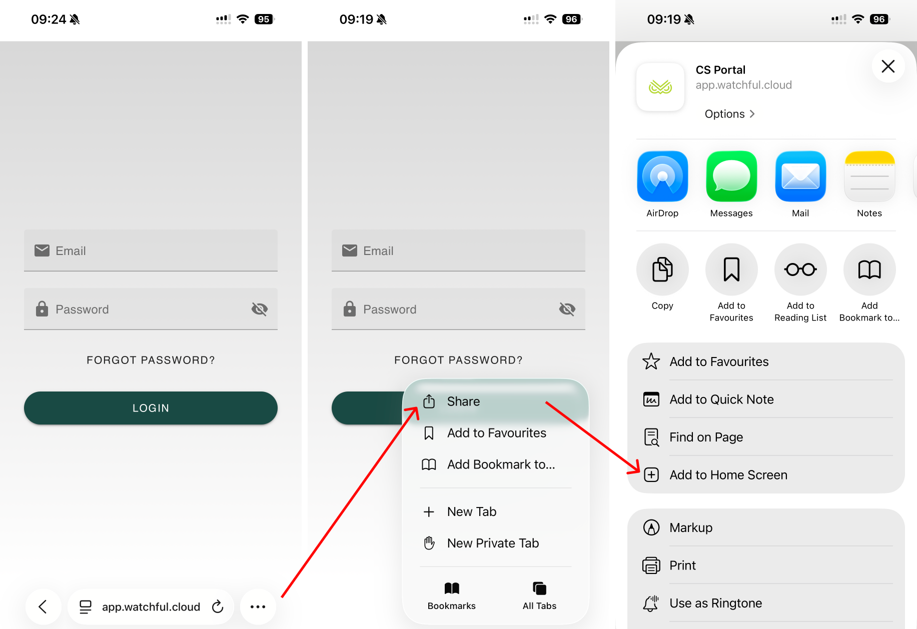 While viewing https://app.watchful.cloud in Safari, tap the three-dot menu, and tap the Share icon.